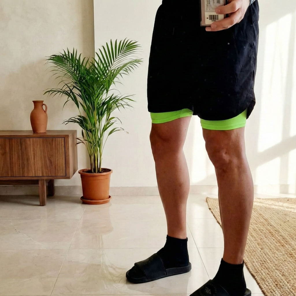 My biggest worry was the inner material. Usually, 2-in-1 shorts have a very rough/itchy liner. But this stuff is legitimate high-performance fabric. It’s super stretchy and breathable. You can see the stitching quality in the close-up—it handles heavy squats easily without tearing. Definitely worth the ₹1,299 price tag.